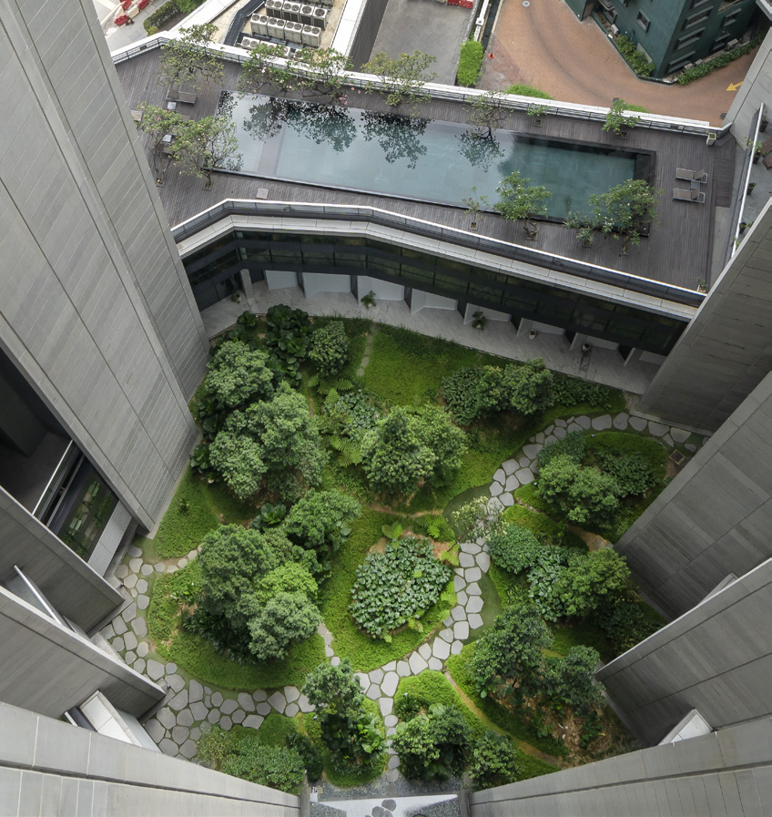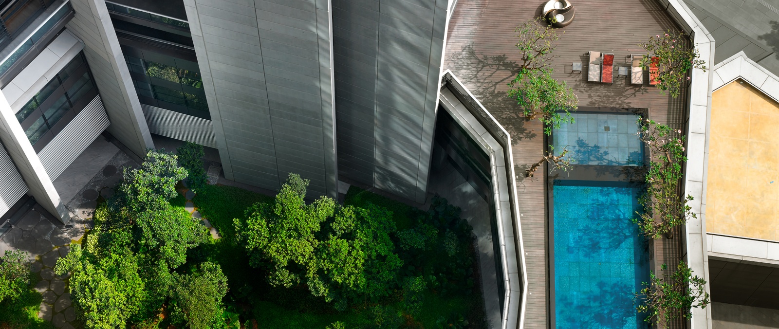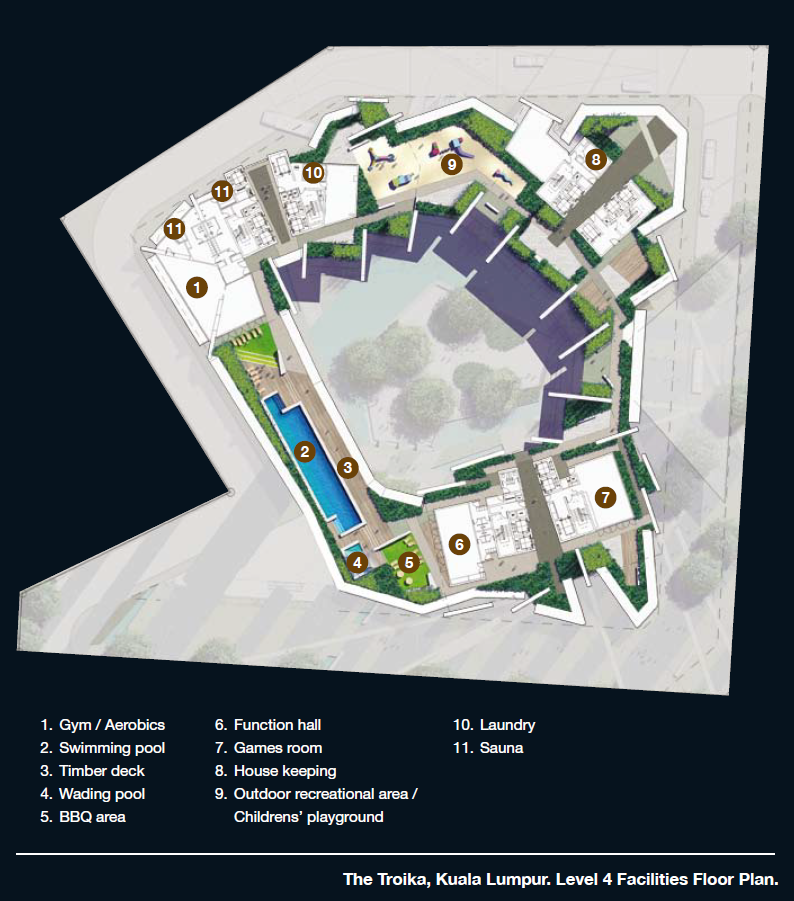 The Sky Lobby, spanning the three towers and connected by two double volume glass encased skybridges. Day or night, it offers unmatched views of the city’s world famous KLCC landmarks. The expansive timber deck plays host to a swimming pool, wading pool and other residents' amenities. The Necklace is a four storey circular podium from which the towers rise. Retail outlets, restaurants and offices are housed within, whilst the roof accommodates the residents' recreational facilities.